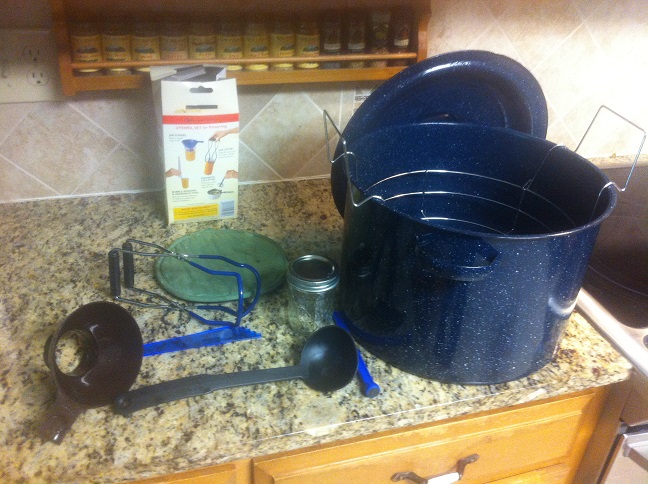 Large pot(1) for heat treating the jars Large pot(2) for boiling jam (not shown) jar tongs (optional, but strongly advised) ladle Wire basket fitting into pot 1 (optional) wide mouth funnel (optional) |