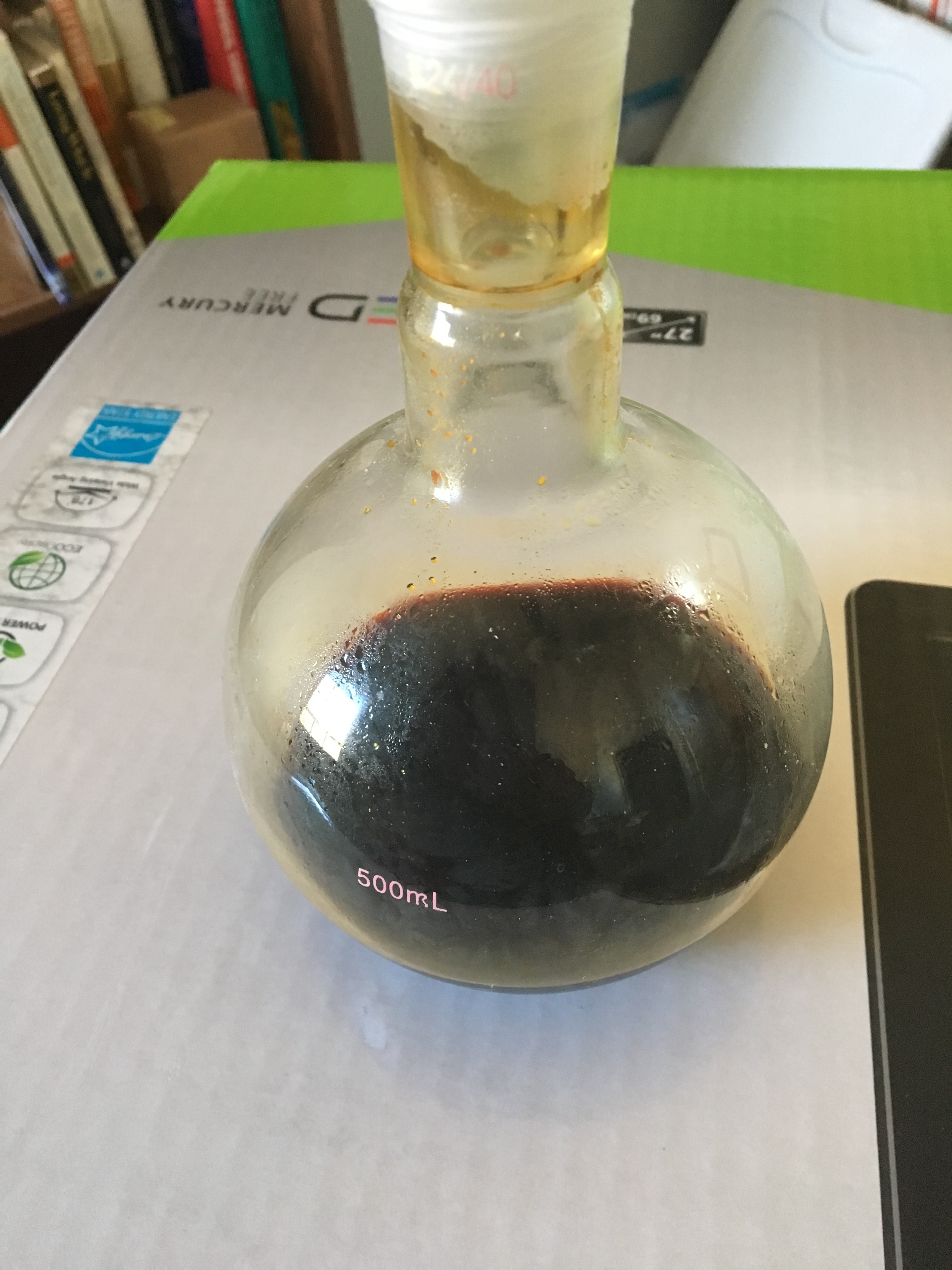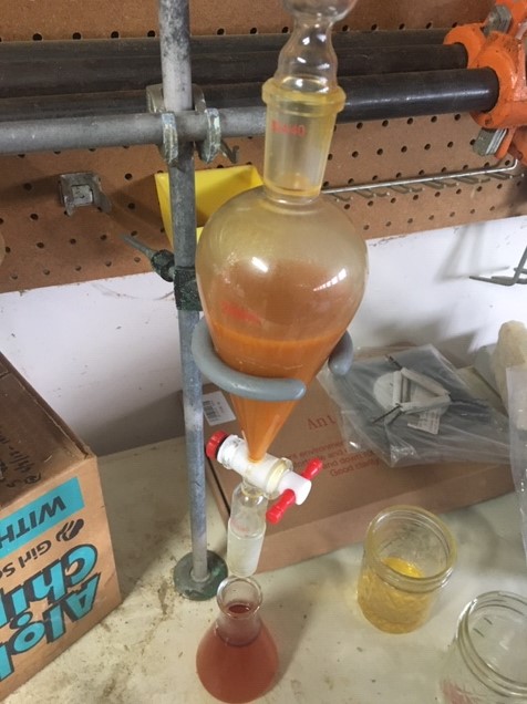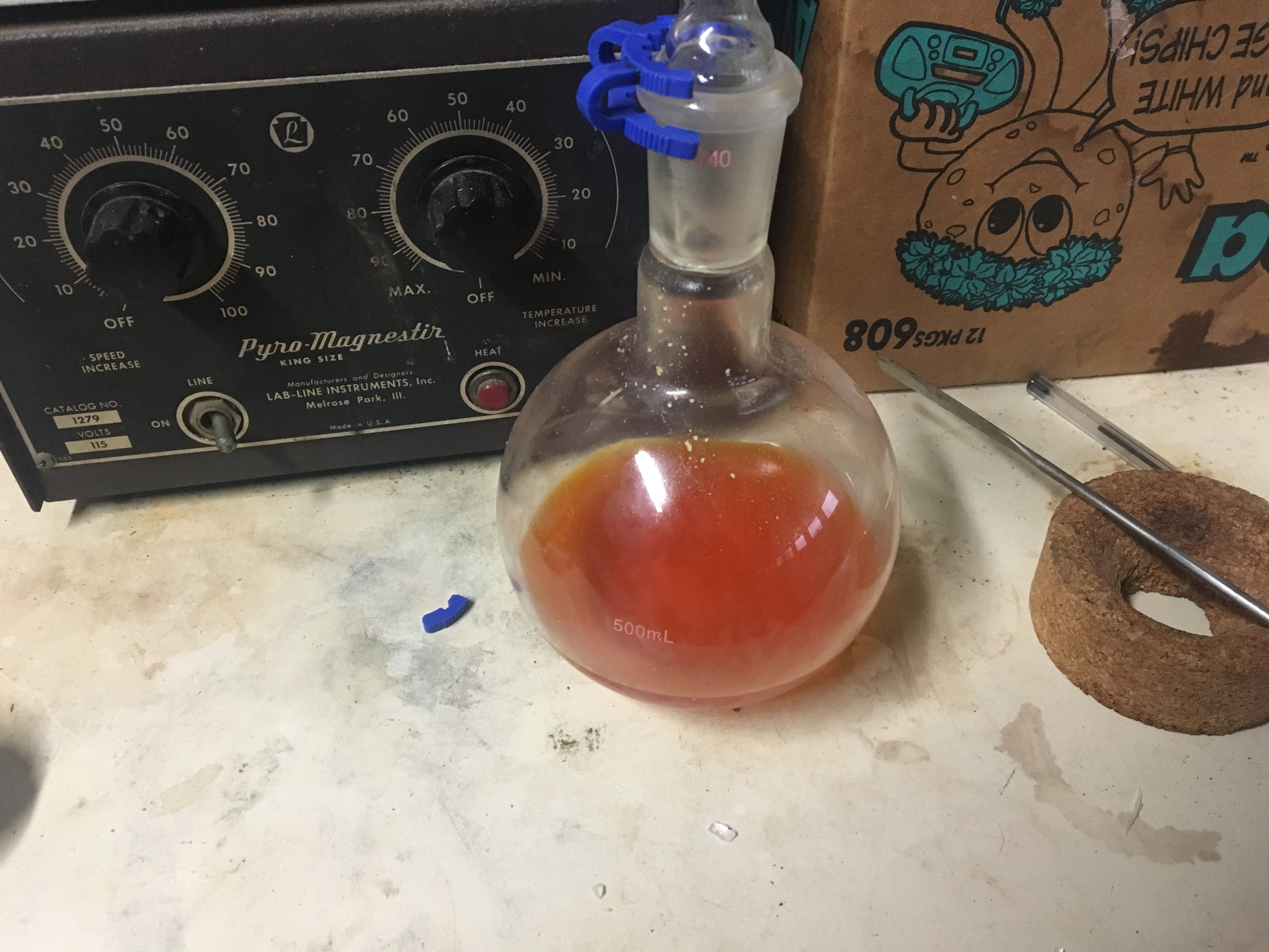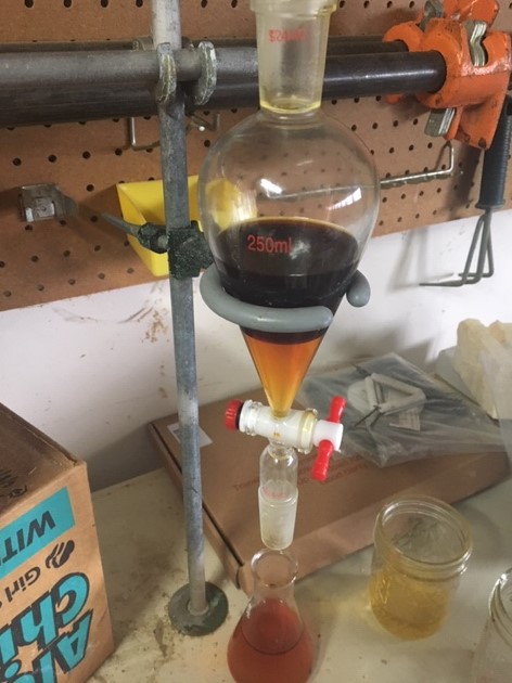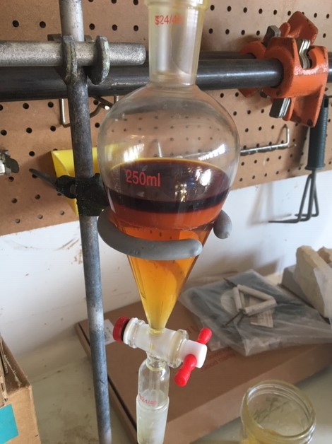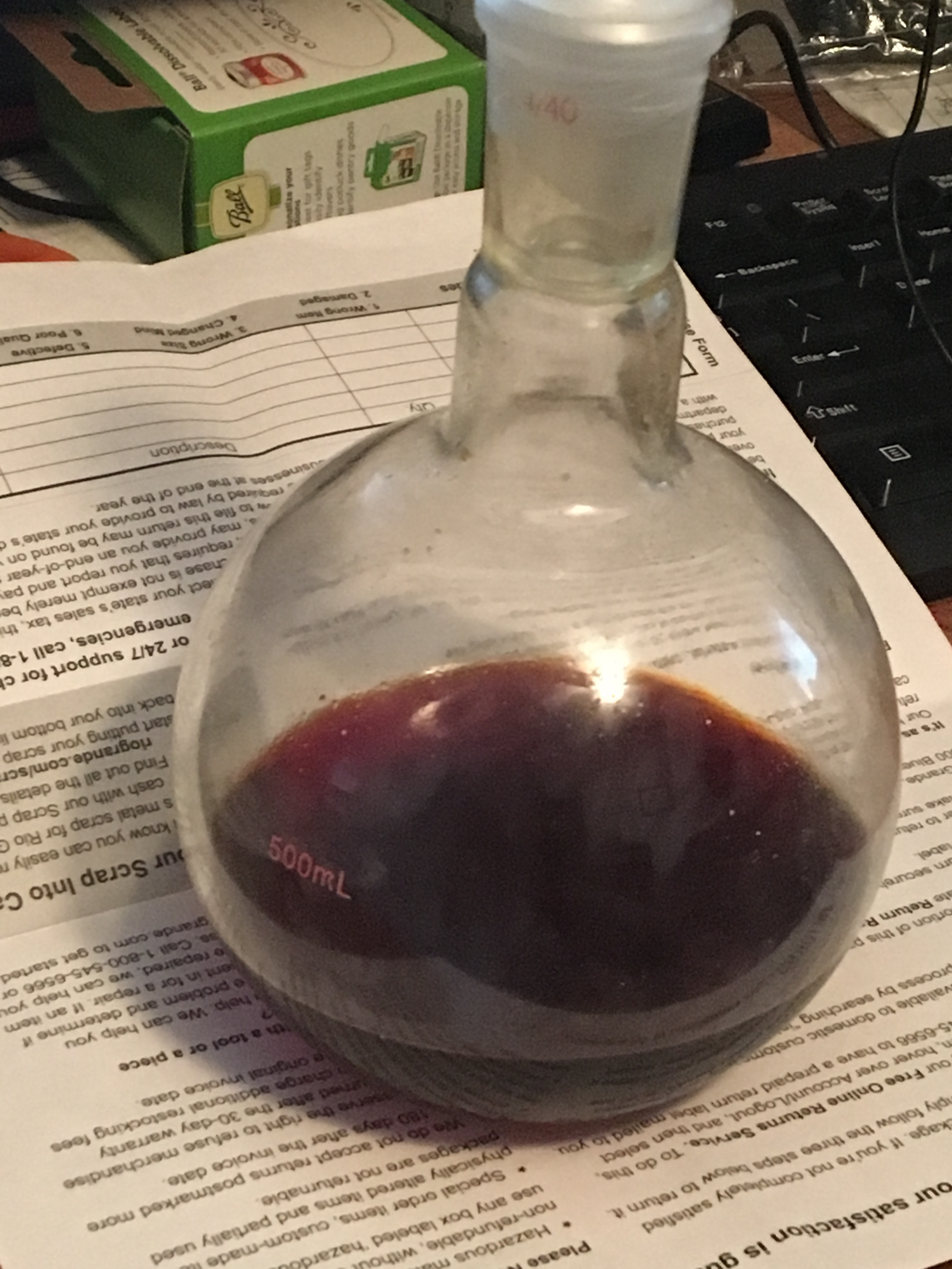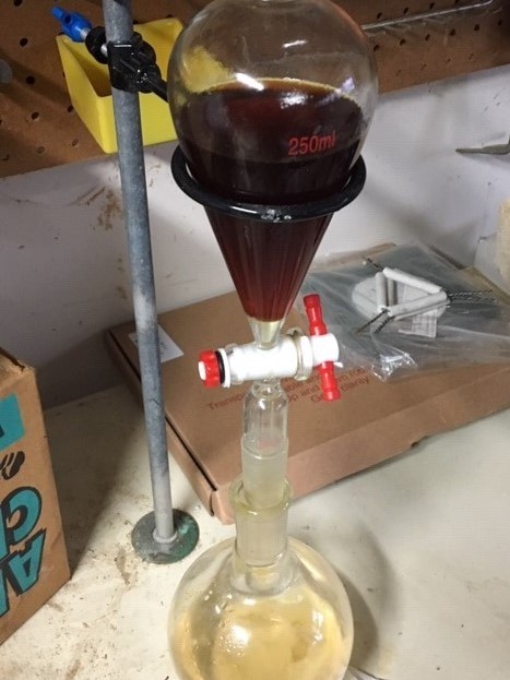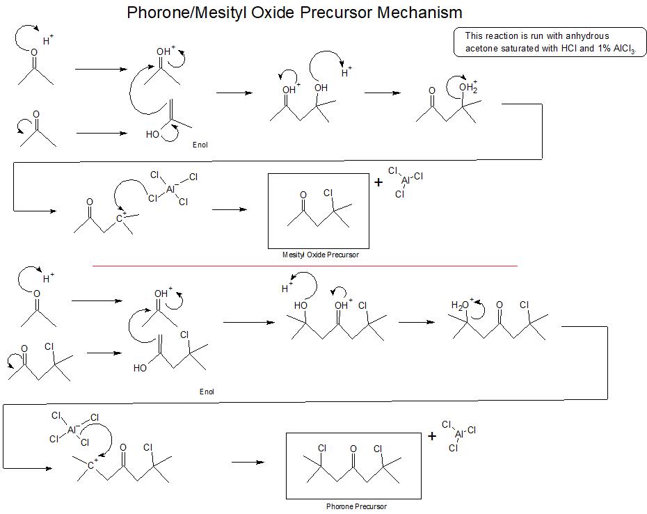Between my sophmore and junior years in chemistry, I was a lab assistant for the Columbus College Chemistry department. The supervisor for the lab assistants was a professor by the name of Al Osteen. Mr. Osteen would often run odd experiments. One such experiment was to add phosphorus pentaoxide to acetone - which resulted in some thick brown sludge along with the remaining acetone. He pointed out that it also had the smell of some flower. A smell none of us could pin down. Mr. Osteen left for greener pastures not long after that but the puzzle remained with me. I parlayed that mystery into a senior project several quarters later to find out what all was in the mixture. Adding phosphorus pentaoxide to acetone triggers a series of Aldol condensations, producing a large number of products. I separated perhaps 6 individual compounds, identifying two: Diacetone alcohol (4-hydroxy,4-methyl,pentan-2-one) and Mesityl oxide, but I never ID'ed the floral smell. It was one of those mysteries that stuck with me. Though I didn't go into chemistry as a profession, it always remained my first love, specifically organic chemistry with a strong emphasis on organic synthesis. Forty five years later, while perusing a book on organic synthesis I'd picked up from Amazon (Organic Syntheses - Vol I), the synthesis for Mesityl oxide caught my eye. As I read the procedure, I noticed a mention of a by-product called Phorone. In all my years in organic I'd never heard of phorone so I looked it up on wikipedia. I was dumbstruck by a single line, casually mentioned in the description: "is a yellow crystalline substance with a geranium odor". I discovered the identity of my mystery compound. I tried to track down Mr. Osteen, only to find out he'd died three years earlier. I wasn't able to let him know I'd solved the mystery. Not being able to inform him of my discovery, I decided to try a synthesis of phorone. A search of the web brought me to a paper, Novel Aspects in the Preparation of Phorone by Maria Koieczny and George Sosnovsky at the University of Wisconsin-Milwaukee, published January 4, 1978. It provided a good procedure for the synthesis of phorone and mesityl oxide. These are the syntheses for mesityl oxide and phorone (click pic for mechanism) ![]() Procedure