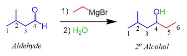 Electrophillic addition | Grignard reaction with Aldehyde | Prod: 2° alcohol | |||||