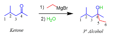 Electrophillic addition | Grignard reaction with ketone | Prod: 3° alcohol |