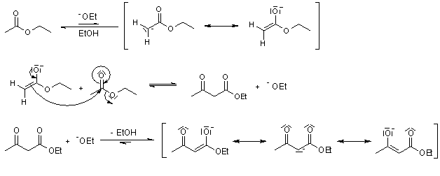 The Claisen Condensation between esters containing α-hydrogens, promoted by a base such as sodium ethoxide, affords β-ketoesters. The driving force is the formation of the stabilized anion of the β-keto ester. If two different esters are used, an essentially statistical mixture of all four products is generally obtained, and the preparation does not have high synthetic utility. |