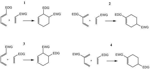 A consideration of the reactants' frontier molecular orbitals (FMO) makes plain why this is so. (The same conclusion can be drawn from an orbital correlation diagram or a Dewar-Zimmerman analysis.) For the more common "normal" electron demand Diels-Alder reaction, the more important of the two HOMO/LUMO interactions is that between the electron-rich diene's ψ2 as the highest occupied molecular orbital (HOMO) with the electron-deficient dienophile's π* as the lowest unoccupied molecular orbital (LUMO). However, the HOMO-LUMO energy gap is close enough that the roles can be reversed by switching electronic effects of the substituents on the two components. In an inverse (reverse) electron-demand Diels-Alder reaction, electron-withdrawing substituents on the diene lower the energy of its empty ψ3 orbital and electron-donating substituents on the dienophile raise the energy of its filled p orbital sufficiently that the interaction between these two orbitals becomes the most energetically significant stabilizing orbital interaction. Regardless of which situation pertains, the HOMO and LUMO of the components are in phase and a bonding interaction results as can be seen in the diagram below. Since the reactants are in their ground state, the reaction is initiated thermally and does not require activation by light.