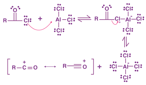 The halide of the acyl halide attacks the AlCl3. The delta positive side of the alkyl group forms a cation with the loss of the Cl to the AlCl4- and is attacked by the double bond electrons of the aromatic, bonding the alkyl carbon to the aromatic ring, and leaving a carbocation at the other side of the now missing double bond. The extra hydrogen (beside the acyl group) can be removed by a base, leaving it's electrons to reform a double bond (and the aromaticity) or the electrons can shift to the other side of the added group and do the same thing. |