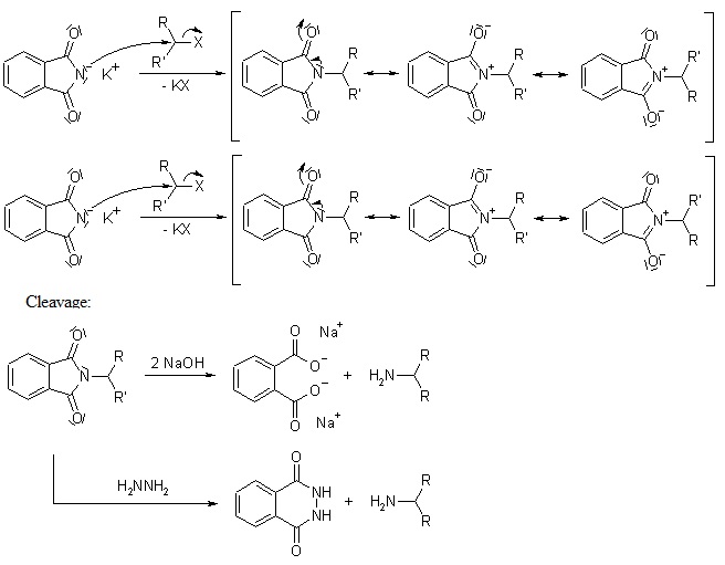 Phthalimide is treated with a KOH/H2O, then mixed with an alkyl or aryl halide. Then is treated with NaOH to hydrolyse the phthalimide condensation product to the 1° amine and 2-(Carboxycarbonyl)benzoic acid. This has a strong advantage over the standard alkyl condensation with ammonia or an amine in that it is self-limiting to a primary amine, given the phthalimide is no longer a nucleophile after the condensation. |