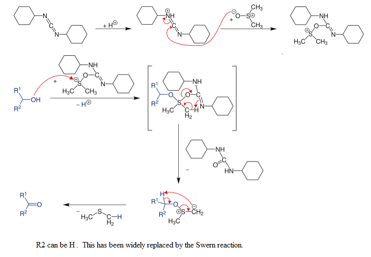 Typically the sulfoxide and diimide are used in excess. The reaction cogenerates dimethyl sulfide and a urea. Dicyclohexylurea ((CyNH)2CO) can be difficult to remove from the product. In terms of mechanism, the reaction is proposed to involve the intermediary of an sulfonium group, formed by a reaction between DMSO and the carbodiimide. This species is highly reactive and is attacked by the alcohol. Rearrangement give an alkoxysulfonium ylide which decomposes to give dimethyl sulfide and the carbonyl compound. This reaction has been largely displaced by the Swern oxidation, which also uses DMSO as an oxidant in the presence of an electrophilic activator. Swern oxidations tend to give higher yields and simpler workup; however, they typically employ cryogenic conditions |
