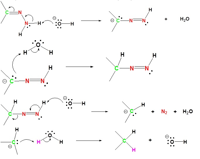In general, the reaction mechanism first involves the in situ generation of a hydrazone by condensation of hydrazine with the ketone or aldehyde substrate [see ketone/aldehyde amination for that part of the mechanism]. Sometimes it is however advantageous to use a pre-formed hydrazone as substrate (see modifications). The rate determining step of the reaction is de-protonation of the hydrazone by an alkoxide base to form a diimide anion by a concerted, solvent mediated protonation/de-protonation step. Collapse of this alkyldiimide with loss of N2 leads to formation of an alkylanion which can be protonated by solvent to give the desired product. Because the Wolff-Kishner reduction requires highly basic conditions, it is unsuitable for base-sensitive substrates. In some cases, formation of the required hydrazone will not occur at sterically hindered carbonyl groups, preventing the reaction. However, this method can be superior to the related Clemmensen reduction for compounds containing acid-sensitive functional groups such as pyrroles and for high-molecular weight compounds. |